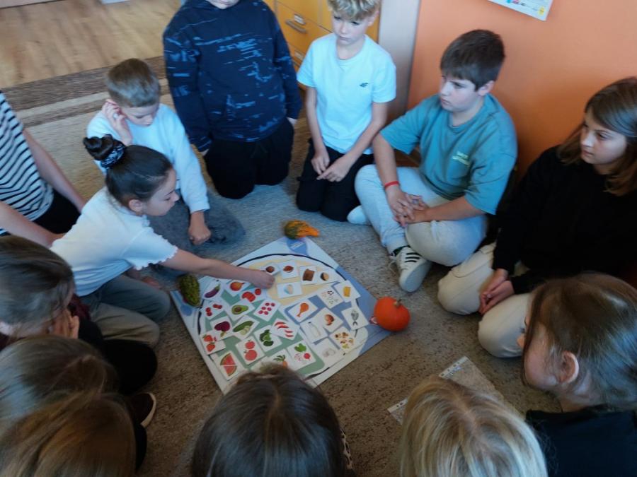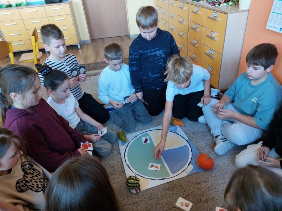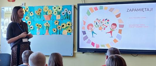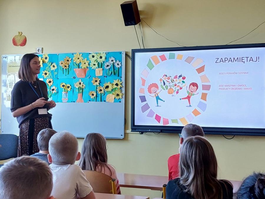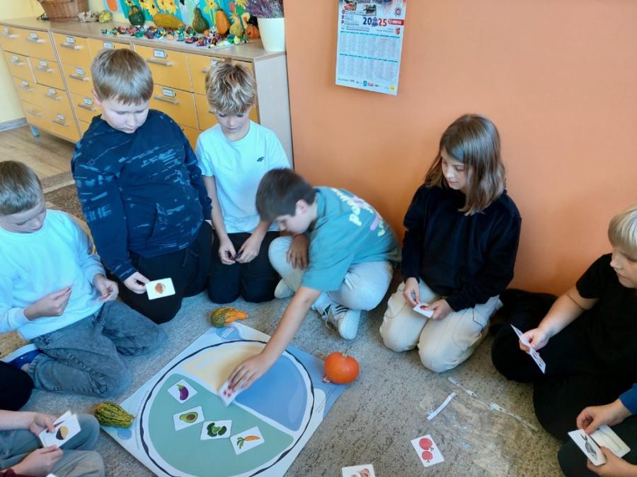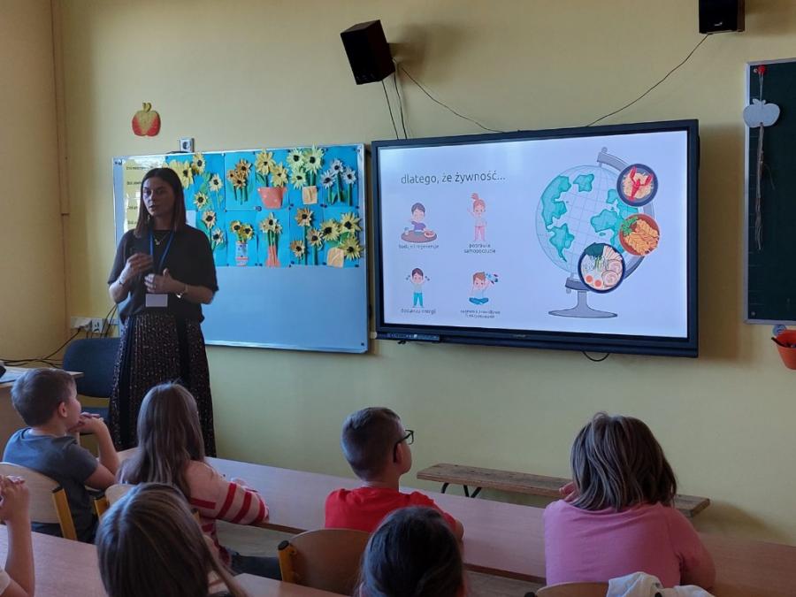 W klasie 3 prowadząca zapoznała uczniów z Talerzem zdrowego żywienia. Jest to prosty sposób na pokazanie, jak powinniśmy komponować nasze codzienne posiłki, aby były zdrowe i pełne energii. Został opracowany przez specjalistów z Instytutu Żywności i Żywienia, by pomóc dzieciom, młodzieży i dorosłym w wyborze właściwych produktów. Połowę talerza powinny stanowić warzywa i owoce – najlepiej różnokolorowe i świeże. Jedna czwarta to produkty zbożowe pełnoziarniste, np. kasze, ryż brązowy, pełnoziarnisty makaron lub pieczywo. Druga czwarta to produkty białkowe – ryby, chude mięso, jajka, rośliny strączkowe czy nabiał. Do picia najlepiej wybierać wodę, a unikać słodkich napojów. Pamiętajmy także o ruchu i aktywności fizycznej każdego dnia! Po prezentacji uczniowie w praktyczny sposób komponowali talerze zdrowego żywienia oraz rozwiązywali zagadki. Zdrowe odżywianie to klucz do dobrego samopoczucia, koncentracji i siły do nauki i zabawy.